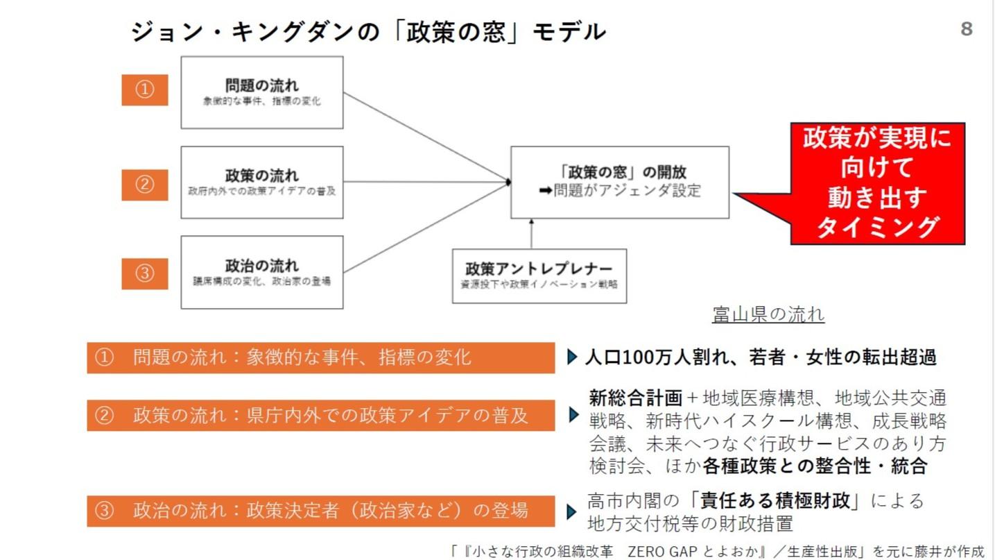 スライド7をご覧ください。アメリカの政治学者ジョン・キングダンが提唱した「政策の窓モデル」をご存知でしょうか。『問題の流れ』『政策の流れ』『政治の流れ』、これら3つの流れが一致したときに「政策の窓」が開き、政策が実現に向けて動き出し、抜本的な改革が可能になるとされています。